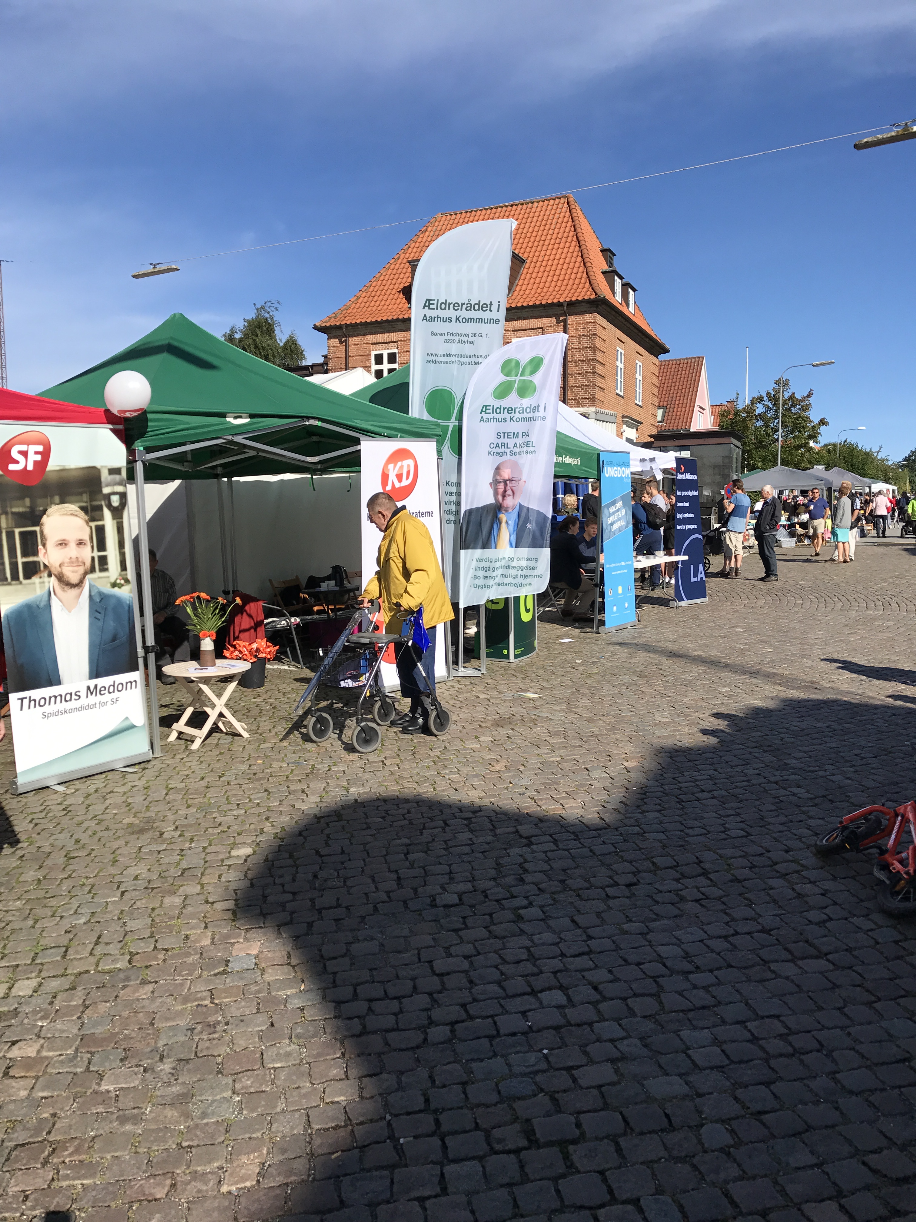 Den flotte flagallé på Silkeborgvej leder alle besøgende til torvet, hvor der foregik mange konkurrencer. De fleste politiske partier deltog med med et telt, og Ældrerådet med mig som eneste repræsentant fik en plads til bannere mellem Konservativ Folkeparti og Kristeligt Folkeparti.  Vort lange banner ragede godt op over teltene, så vi var synlige fra alle sider.